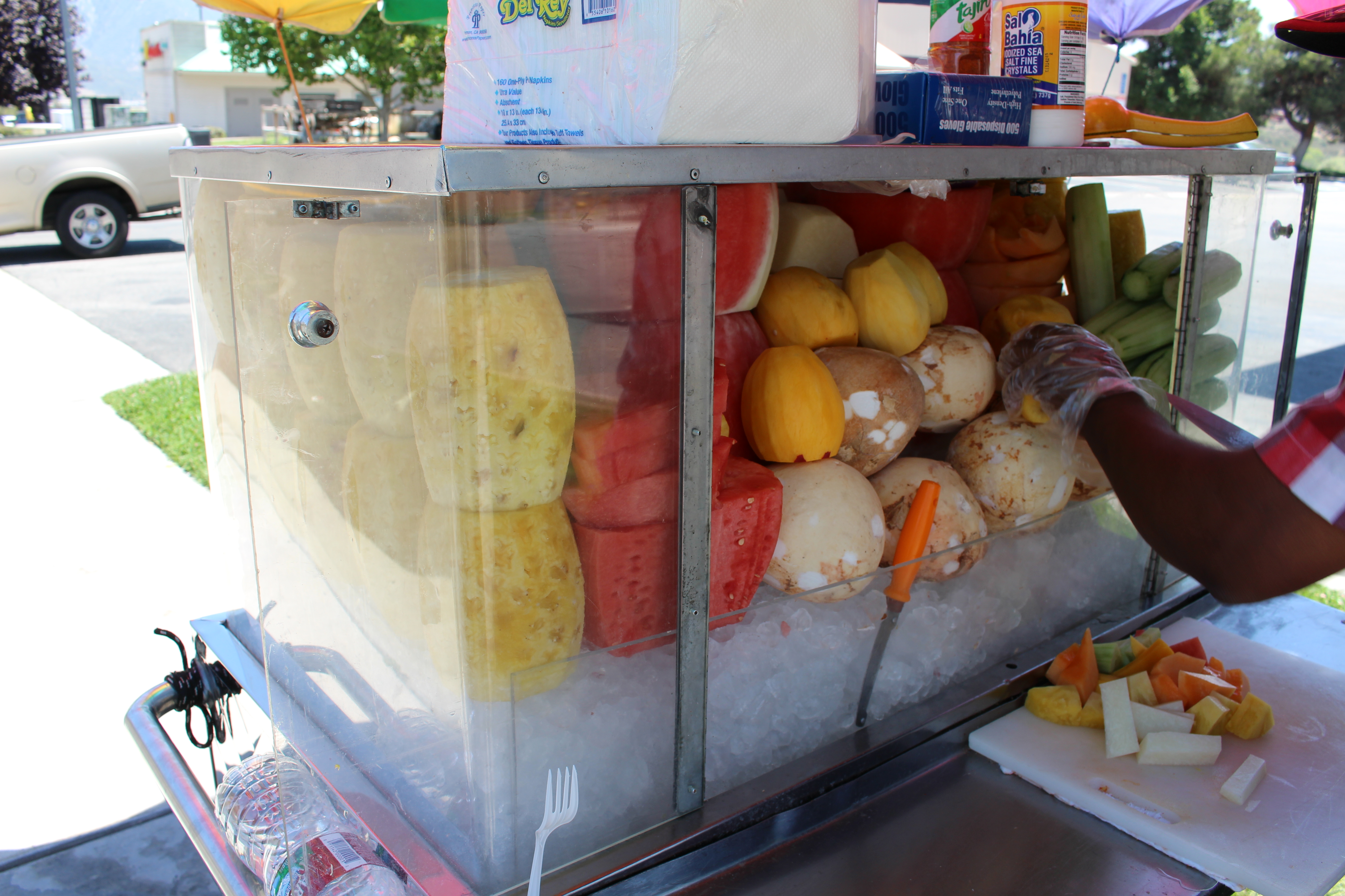 The day after departing Big Bear Lake, Lisa and I caught up to some friends, Reid, a mechanical engineer from Blacksburg, Virginia, and Noah, a recently retired marine from Orange County, CA. They’re a great pair of guys, very different from one another but excellent hiking buddies. We rejoined them in the morning at some hot springs along the trail. Sleepy hikers, both local and thru-, lay about after what appeared to be a hard night of partying. Lisa was sad to have missed out on soaking in the springs while I was rather relieved. After a week of unfamiliar faces, Lisa and I were pleased to join up and hike with Reid and Noah for the next few days. Noah in particular is excited to introduce us to anything remotely associated with southern California culture, including a fruit cocktail near Interstate 15 in Cajon Pass. Stopping at a food cart with a bright, rainbow patterned parasol, Noah insisted we order the works: chunks of pineapple, watermelon, cucumber, mango, cantaloupe, coconut, and (totally new to me!) jicama, all of it doused in chili sauce and lemon juice. Delicious, although Lisa was not into the chili sauce. The rest of the afternoon was spent at a gas station/Del Taco restaurant, gorging on fast food and watching traffic on the highway nearby. Some people pulling into the rest stop eyed us askance while others asked us where we were hiking. A surprising number knew of the PCT.
